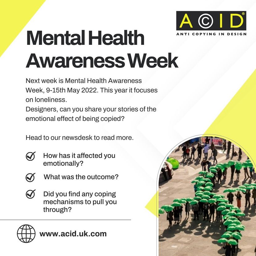 So, for Mental Health Awareness Week this year, our shout out to designers is: We understand and we are here to listen to you. Don’t feel you need to go it alone. Contact us via the normal ways if you need IP support by all means. But we also want to hear your stories to see how we can help.