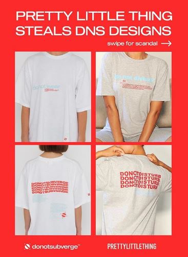 “The temptation to think differently consumes us. Unlike fast fashion brand @prettylittlething, we have spent the last two years pouring our hearts into a brand that represents everything we believe in. A passion for creativity, originality, and the pursuit of non-conformity. This came to life with the launch of our first collection ‘DNS001: DO NOT WEAR’.