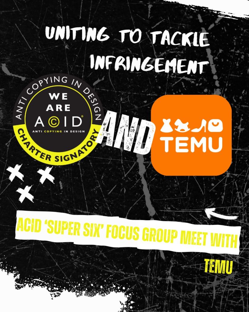 Both image and design infringement, and the apparent lack of punishment for repeat infringers were key frustrations for ACID members. TEMU have been receptive to these criticisms and comments, and intend to work together to rectify each situation proactively as well as reactively through their takedown tools. TEMU also stated their keenness to better understand ACID’s IP Databank as a verified source of truth of copyright and unregistered design ownership – something we are committed to making work for each and every one of our members.