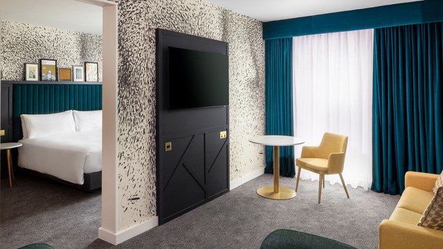 lotte worked with artist Joel Weaver on ‘Disorder in Stasis,’ a striking black-and-white wallpaper derived from the blotting papers used during Joel’s detailed, hand-drawn artwork. These organic marks were transformed into a continuous repeat design. The FSC-certified wallpaper was tailored to fit various Hilton Hotel bedroom layouts to reduce waste, with a wipeable finish chosen for durability in a high-use commercial environment.